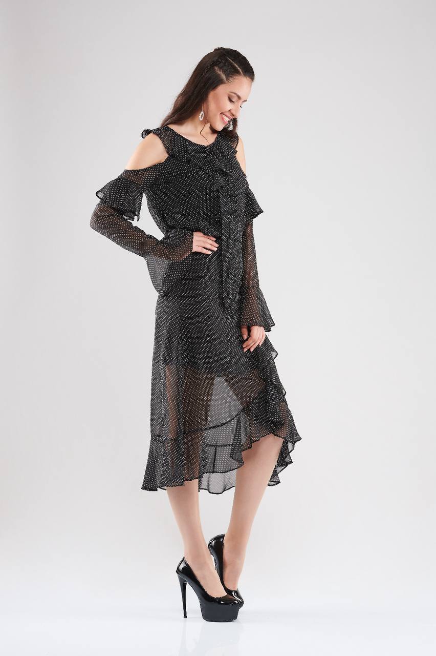 Elegant and airy cold-shoulder midi dress with polka dot details and layered ruffles. Features a sheer flowy fabric with lining for full coverage. Back zip closure.